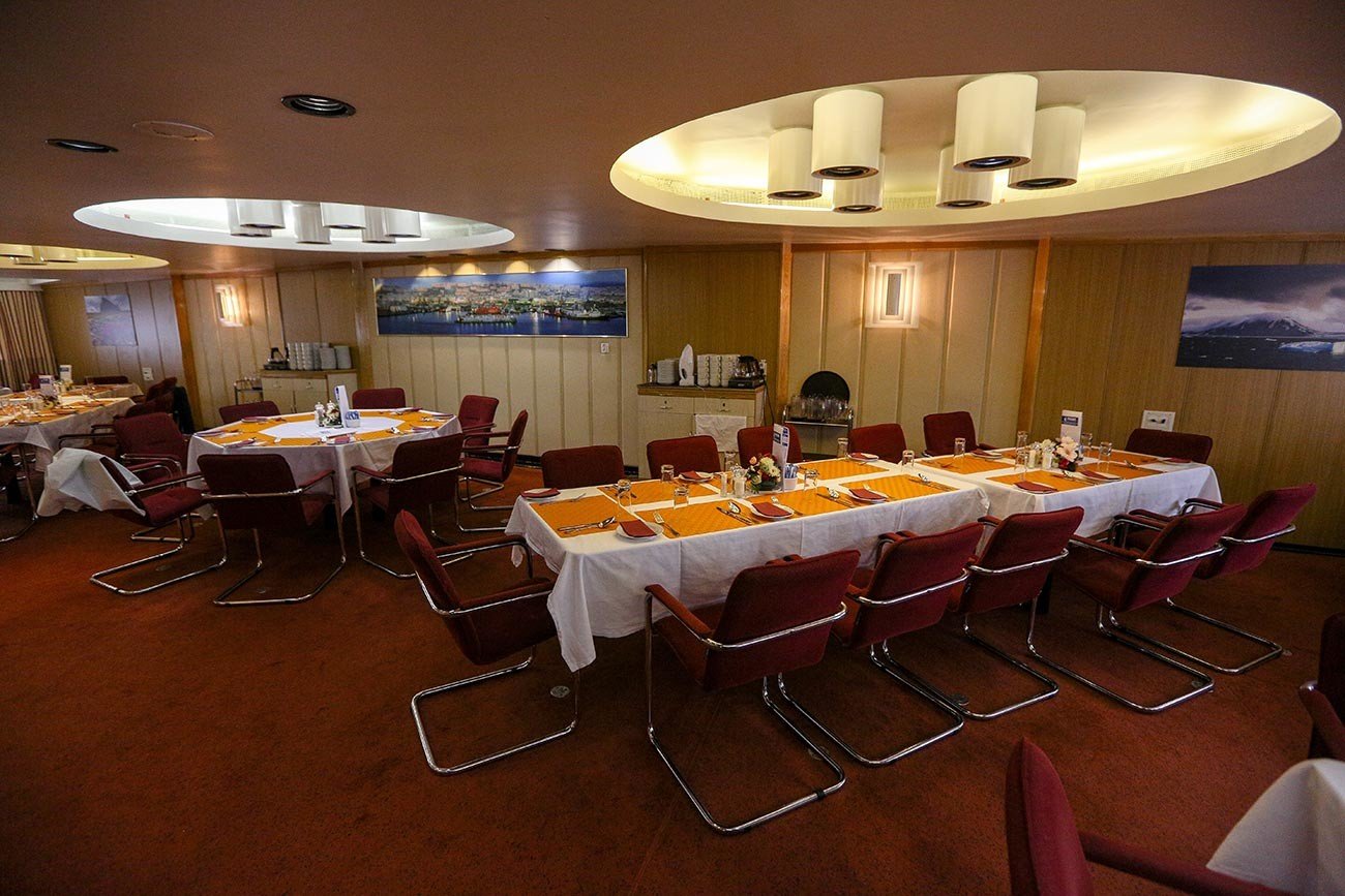 Its spoon-shaped bow crushes ice up to 2.8 m thick. Two reactors producing 75,000 hp. Restaurants, a bar, library, gym, and sauna.